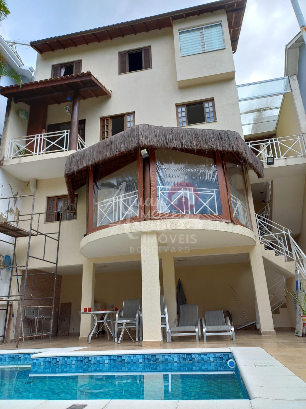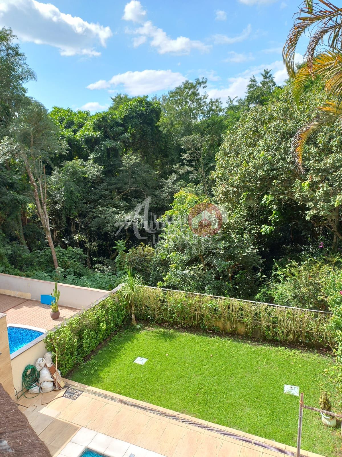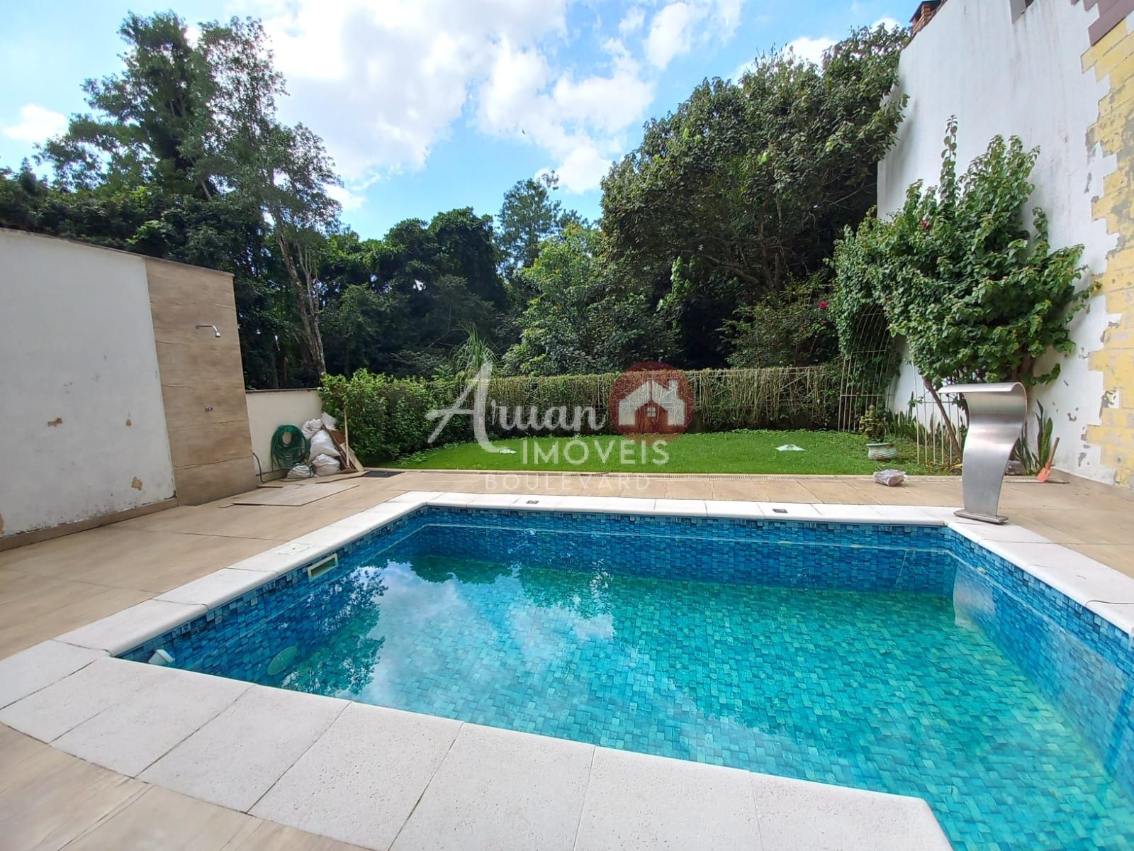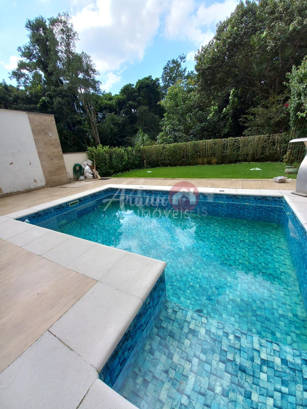 quintal amplo com piscina, gramado e área para espreguiçadeiras