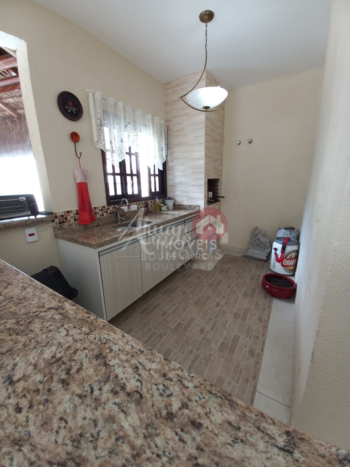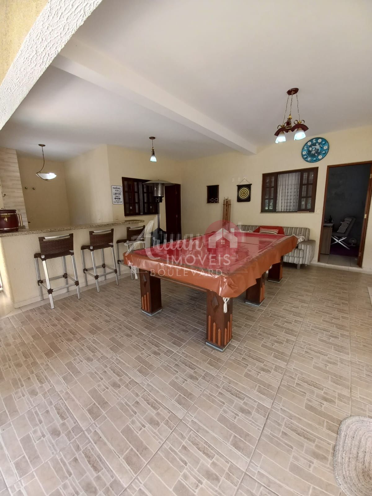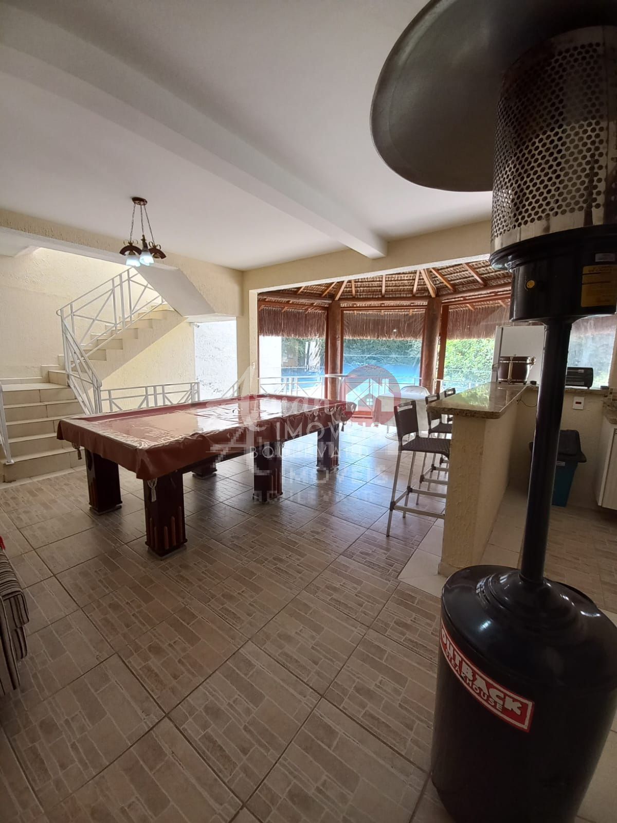 Área gourmet com cozinha completa, churrasqueira, mesa de bilhar, escritório e banheiro