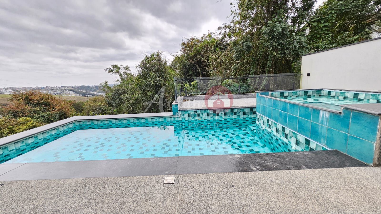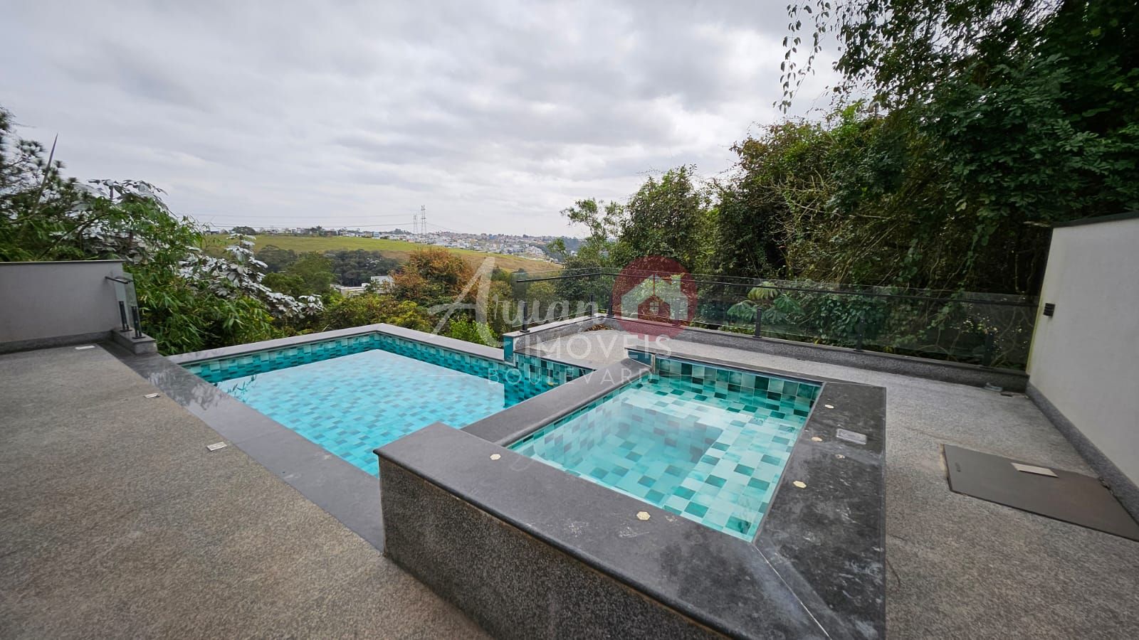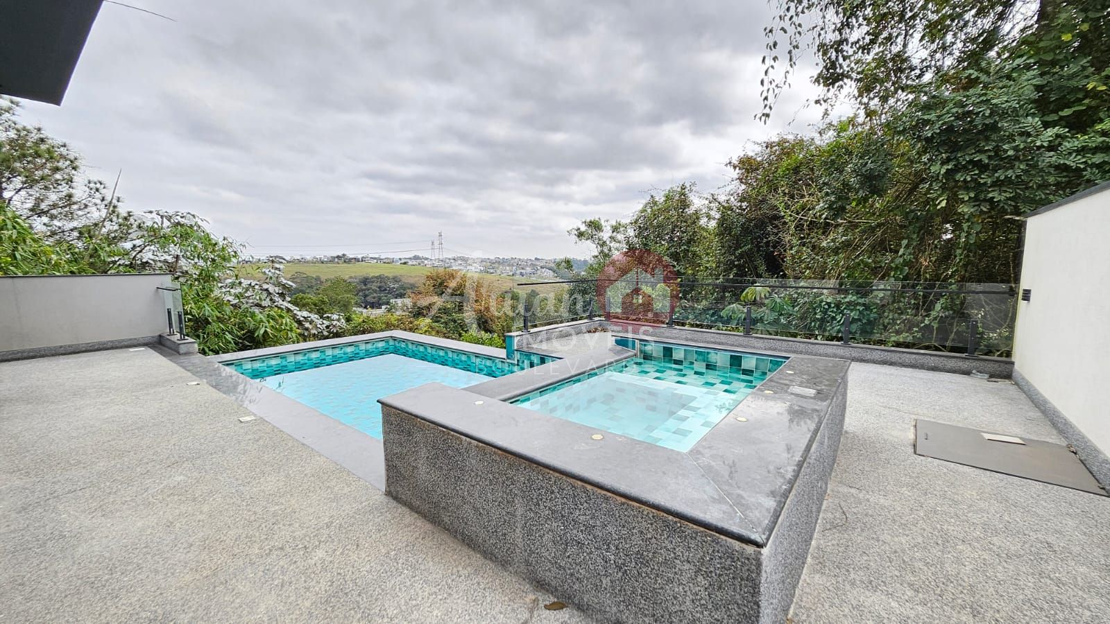 Área gourmet com churrasqueira, piscina com borda infinita, jacuzzi e vista para a reserva, garagem coberta para 8 carros.