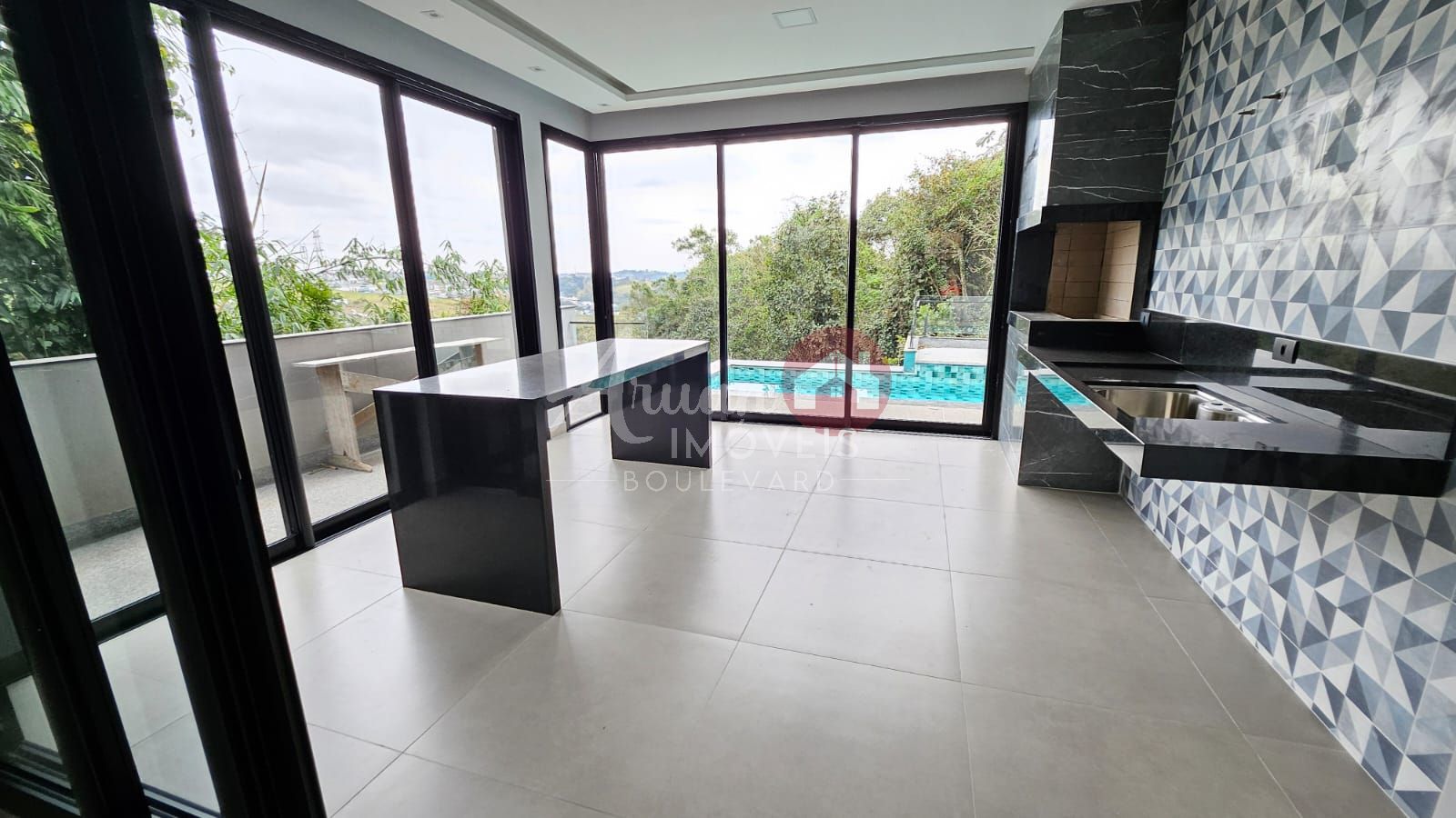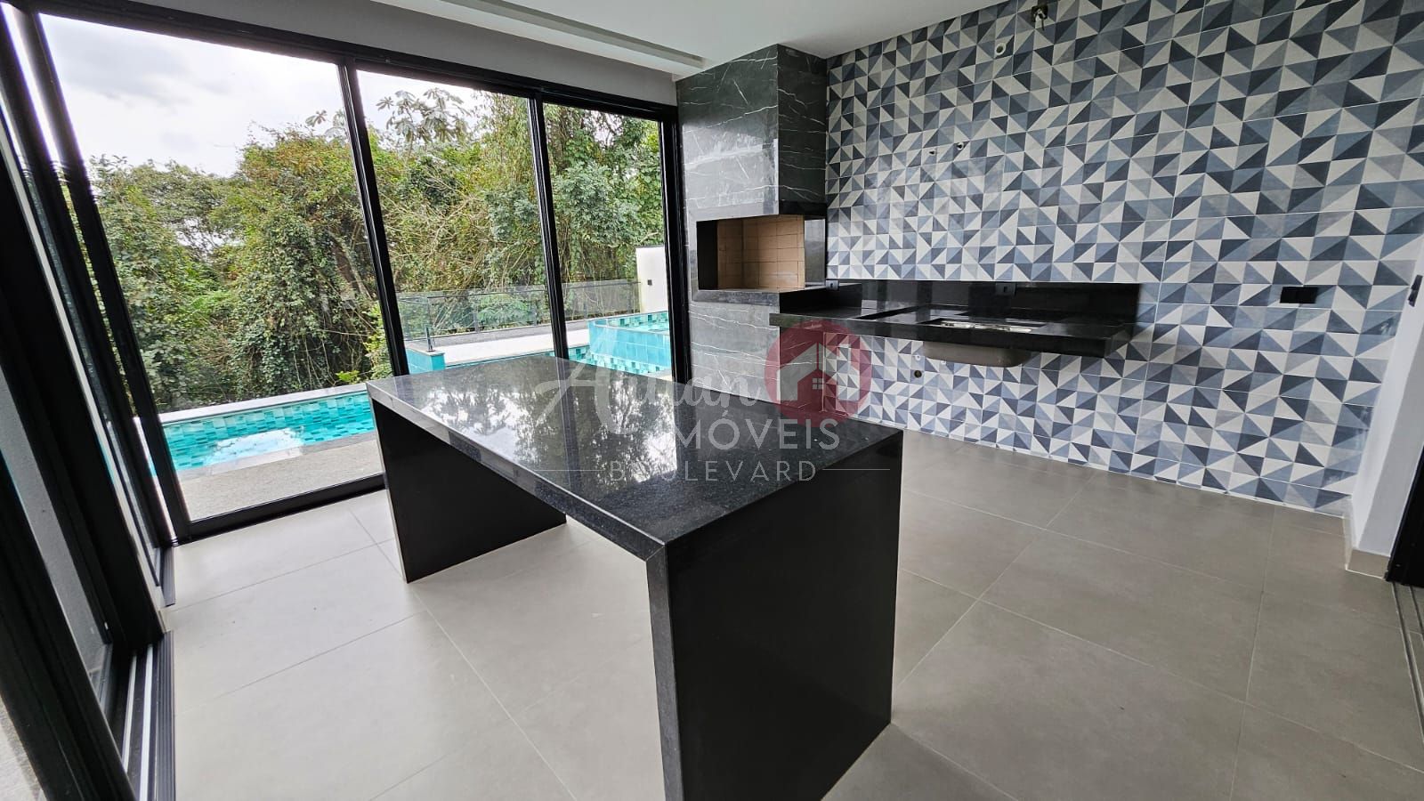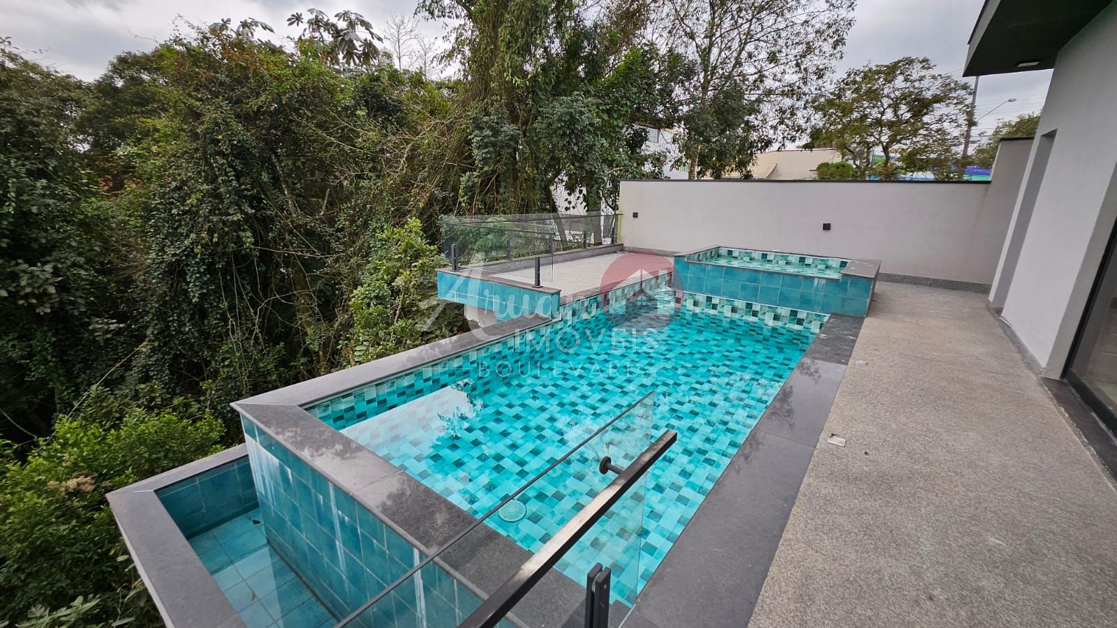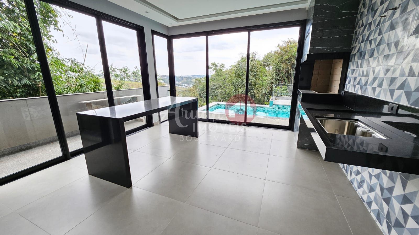Área gourmet com churrasqueira, piscina com borda infinita, jacuzzi e vista para a reserva, garagem coberta para 8 carros.
