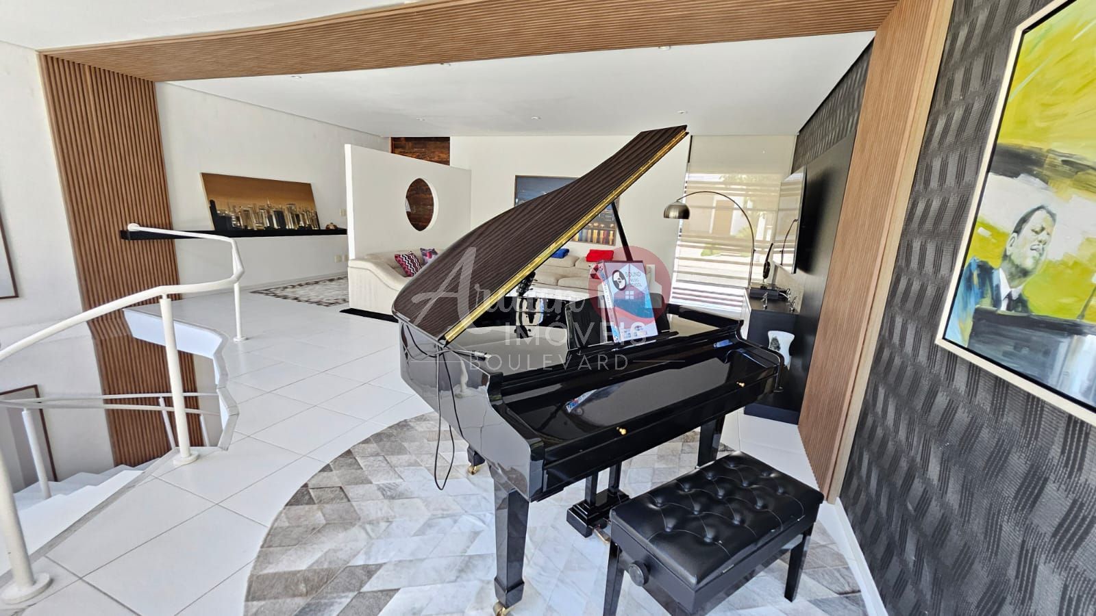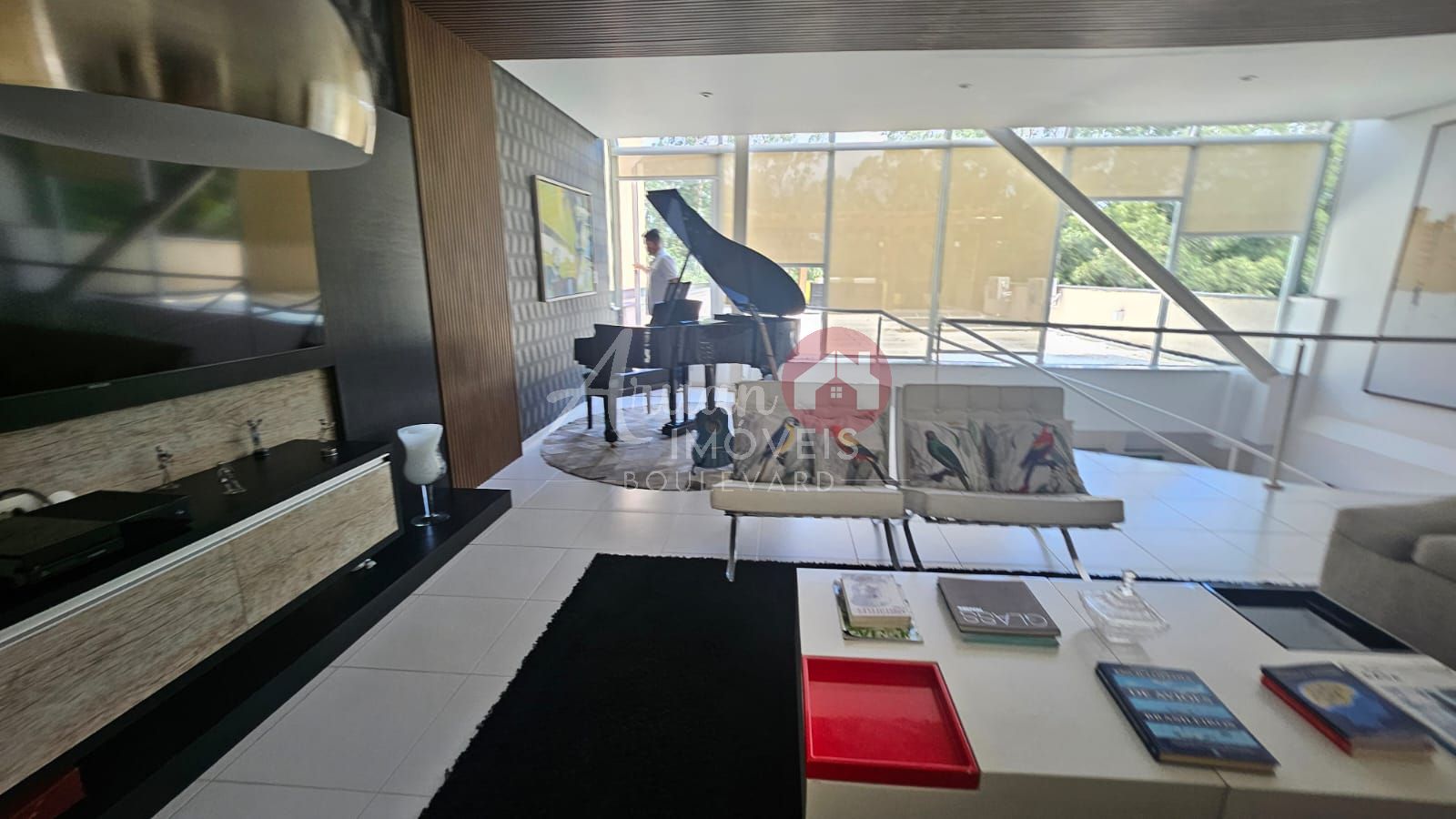 Sala de estar no pavimento térreo com espaço zen e linda vista