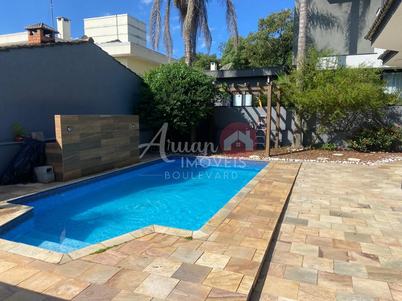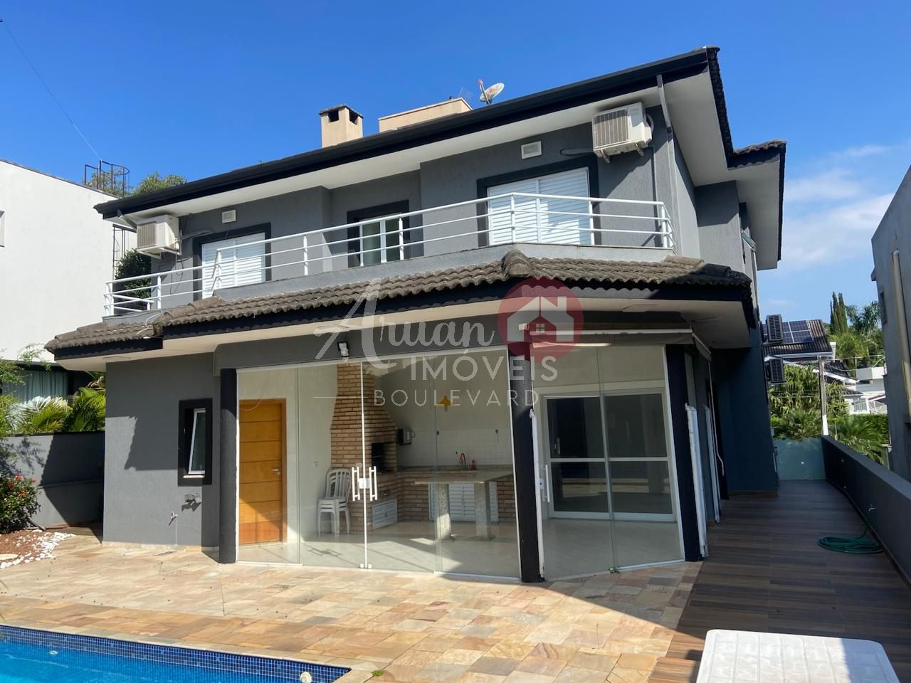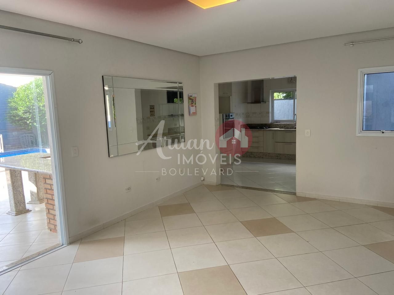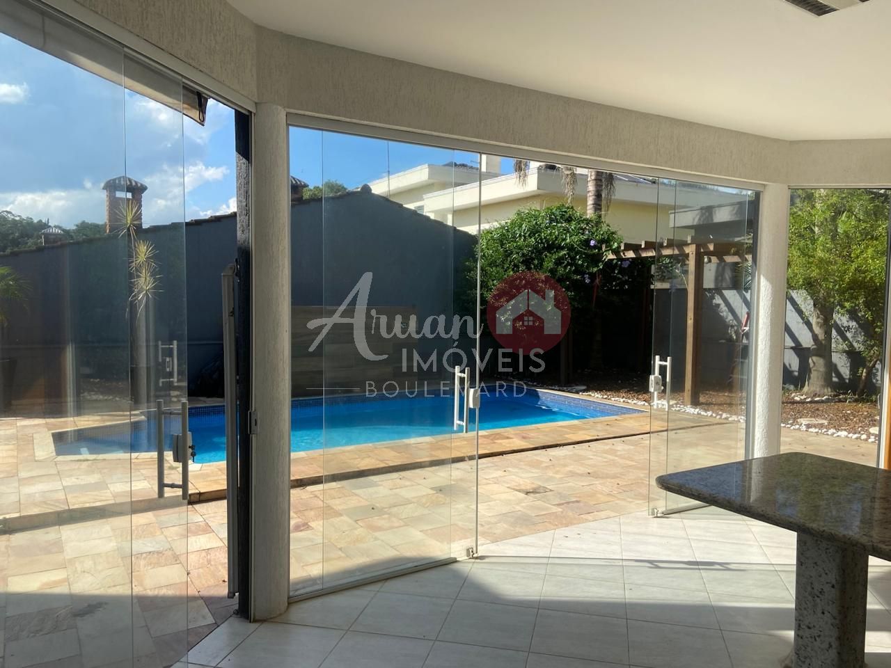 Sala de estar e de jantar integradas com cozinha ampla e equipada com forno e cook pit, área de serviço, espaço gourmet todo envidraçado e com acesso à piscina aquecida com pergolado
