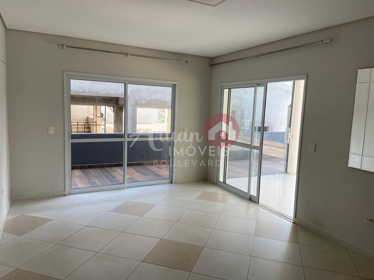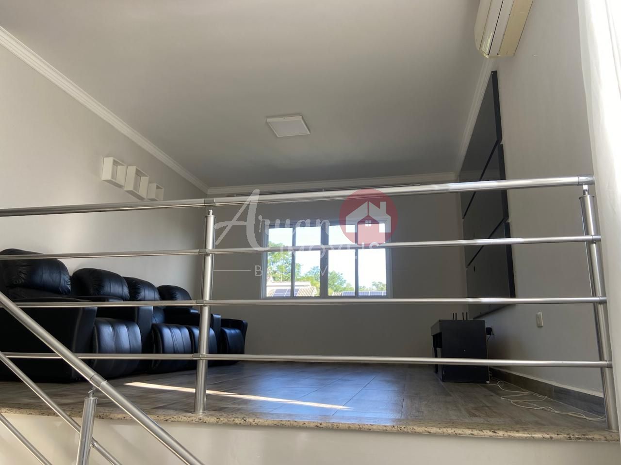 Sala de tv com espaço para telão e com poltronas,